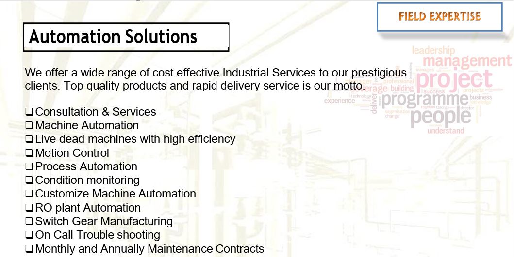 The company is well equipped and always ready to take up, Insurance survey, Quality Inspection, Technical / Industrial / Financial Management of any nature and magnitude, Design / Project Management.